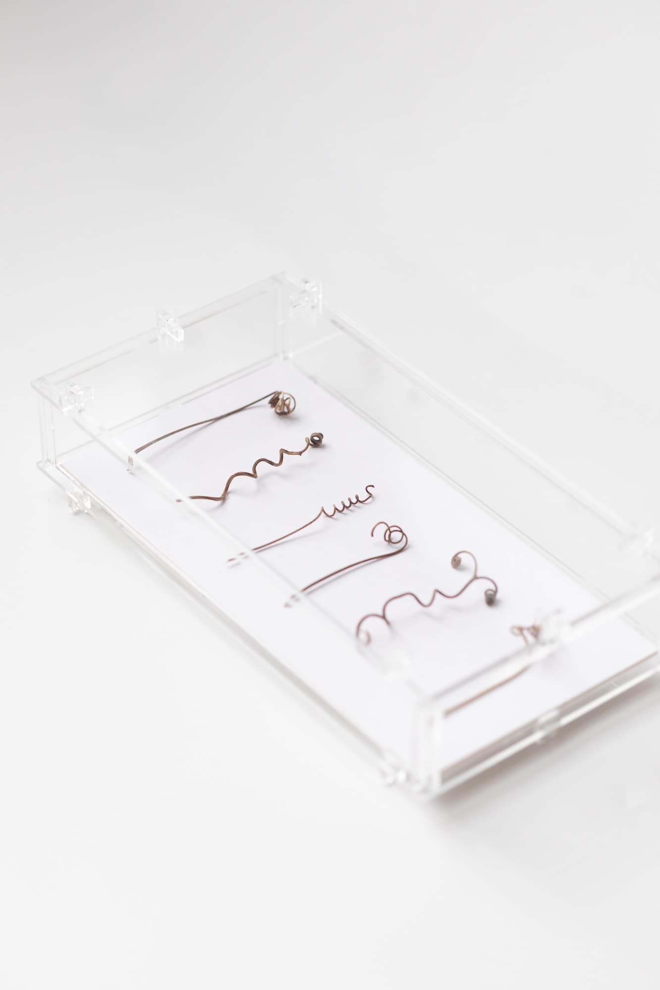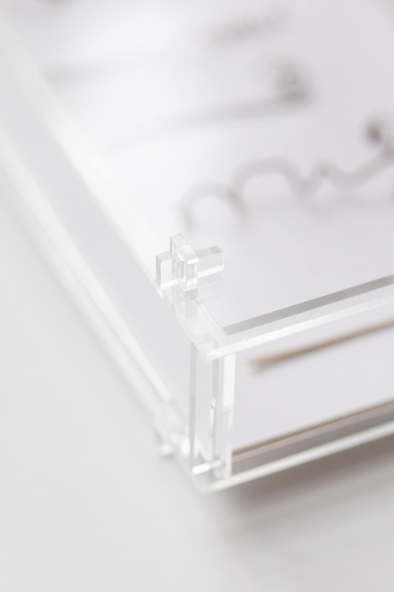 Composição com elementos naturais em vitrine de acrílico produzida por fabricação digital