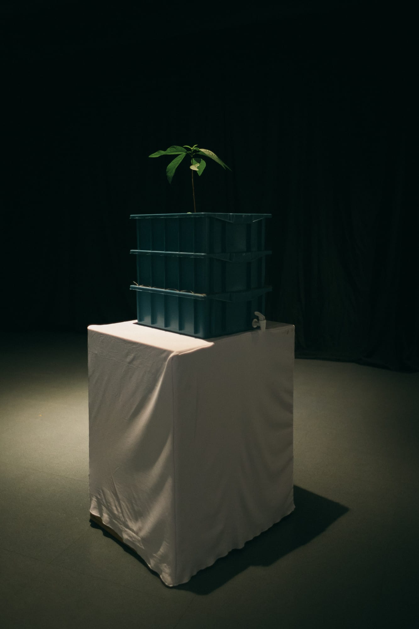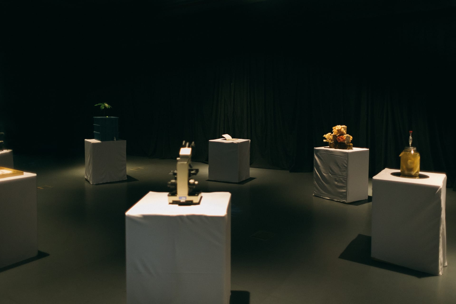 7 totens e uma projeção representando territórios de produção de vida, a partir do pensamento da floresta como conceito e prática.