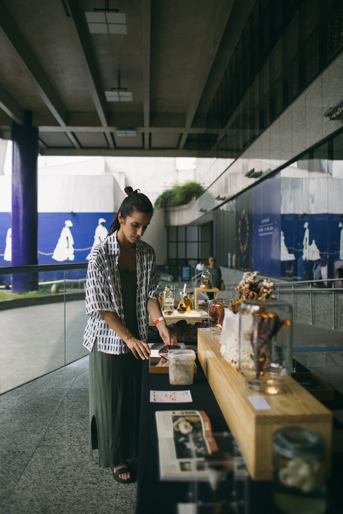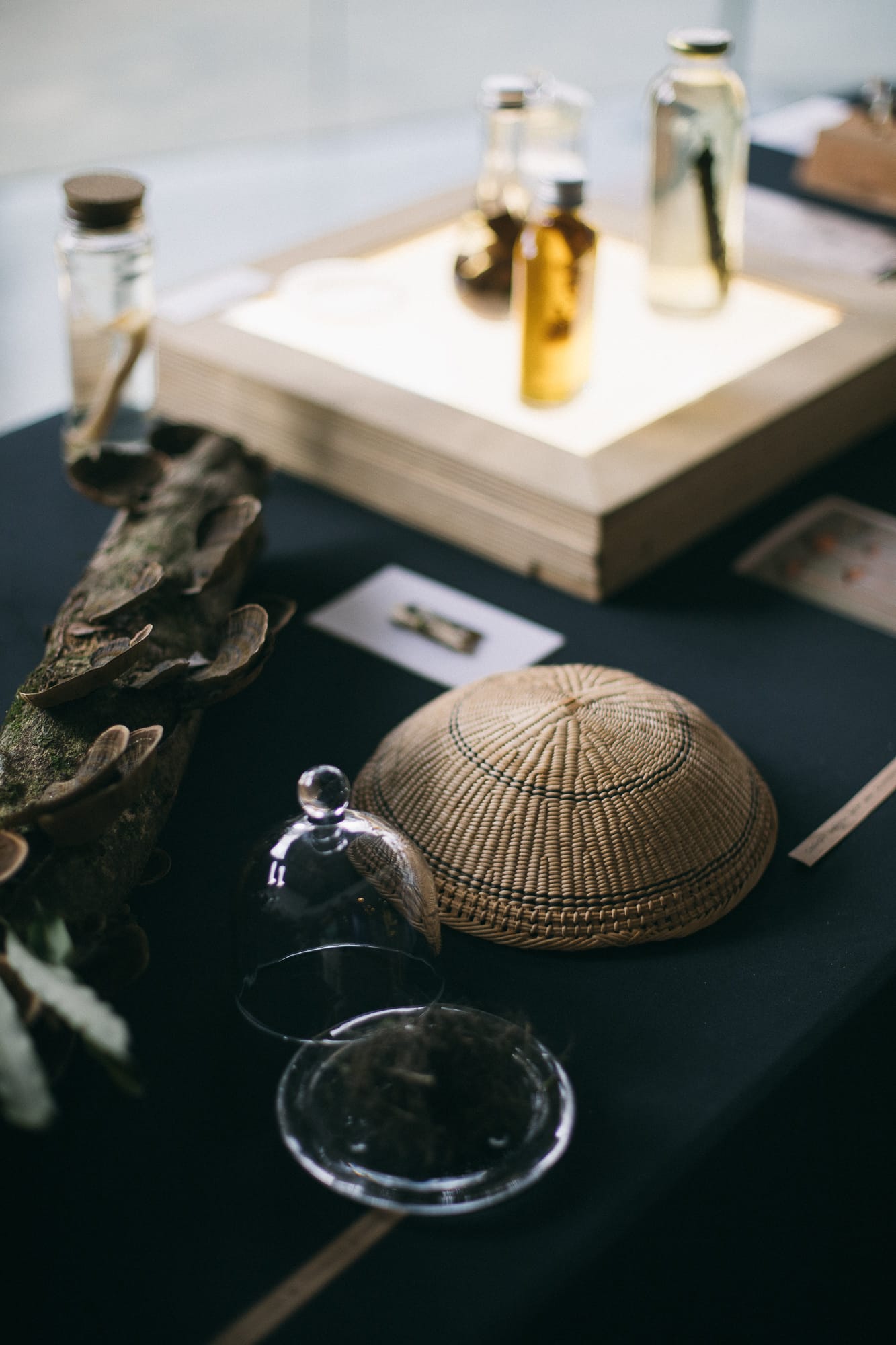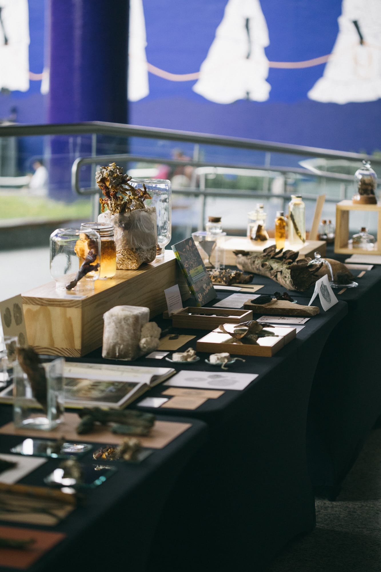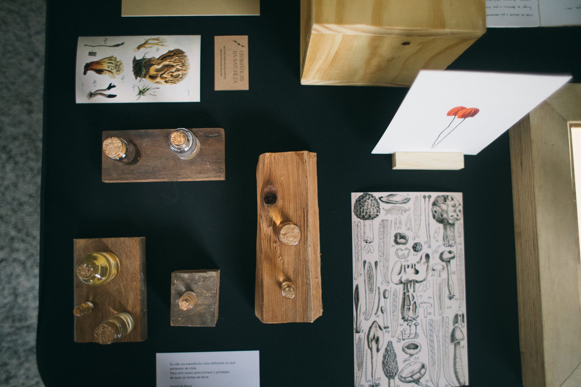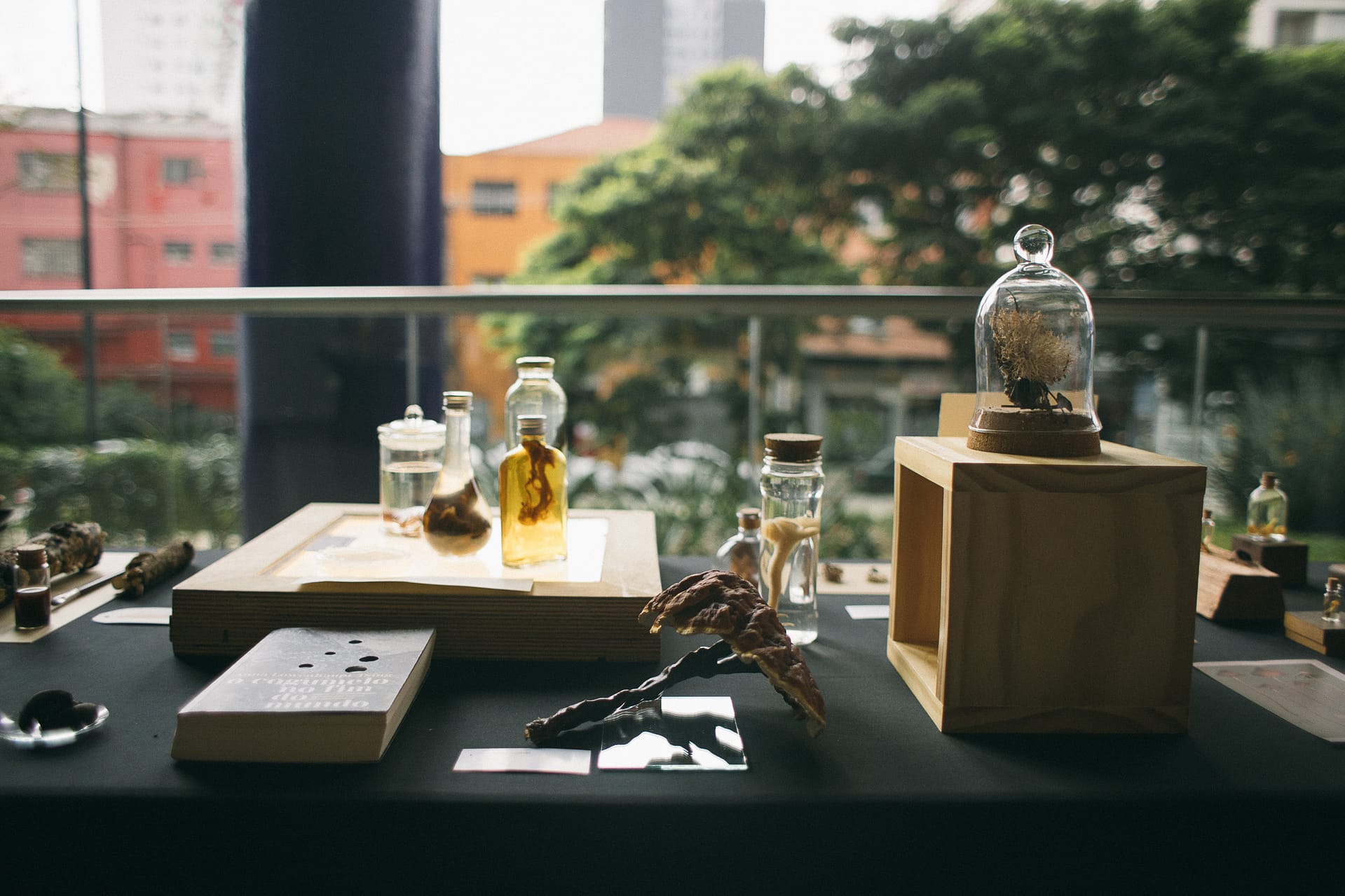 Mesa cartográfica com fungos preservados, representações e objetos etnobotânicos. Painel com 6 fotografias da série “a decomposição liga o céu ao chão” de Vitor Barão.