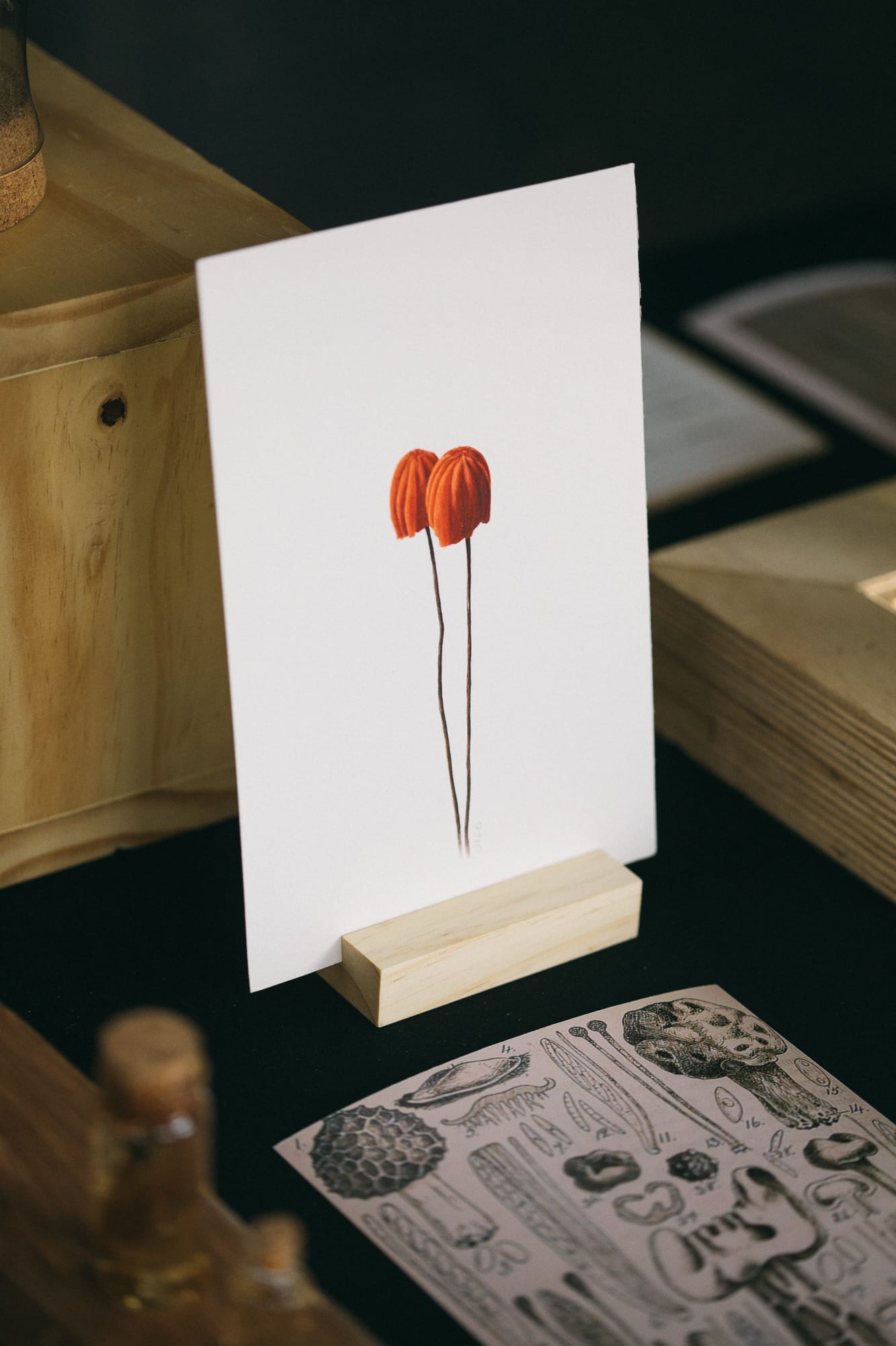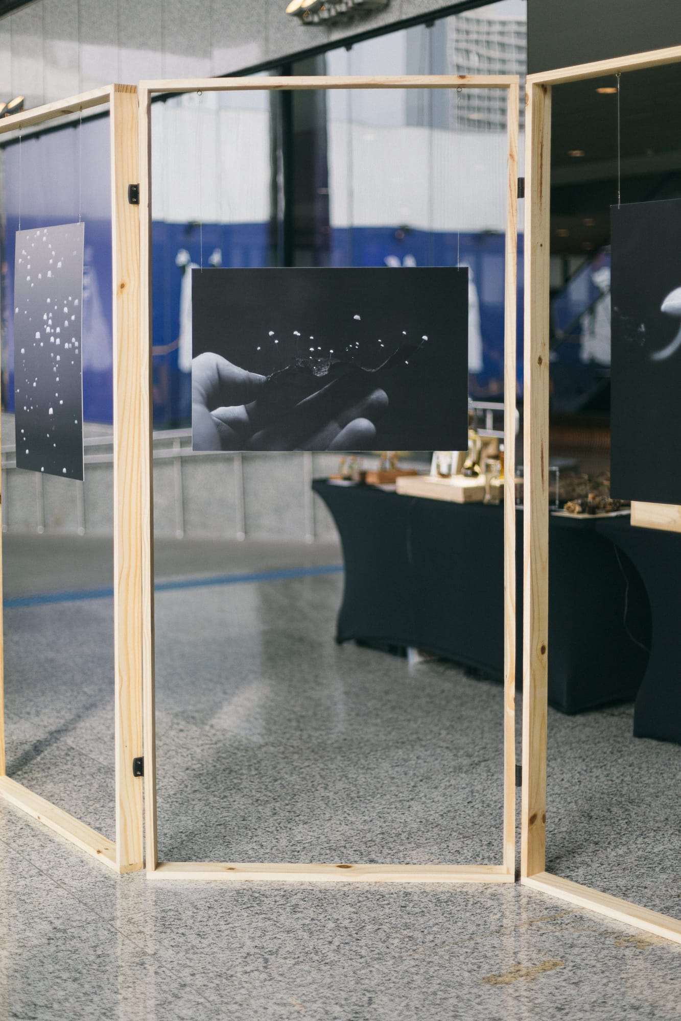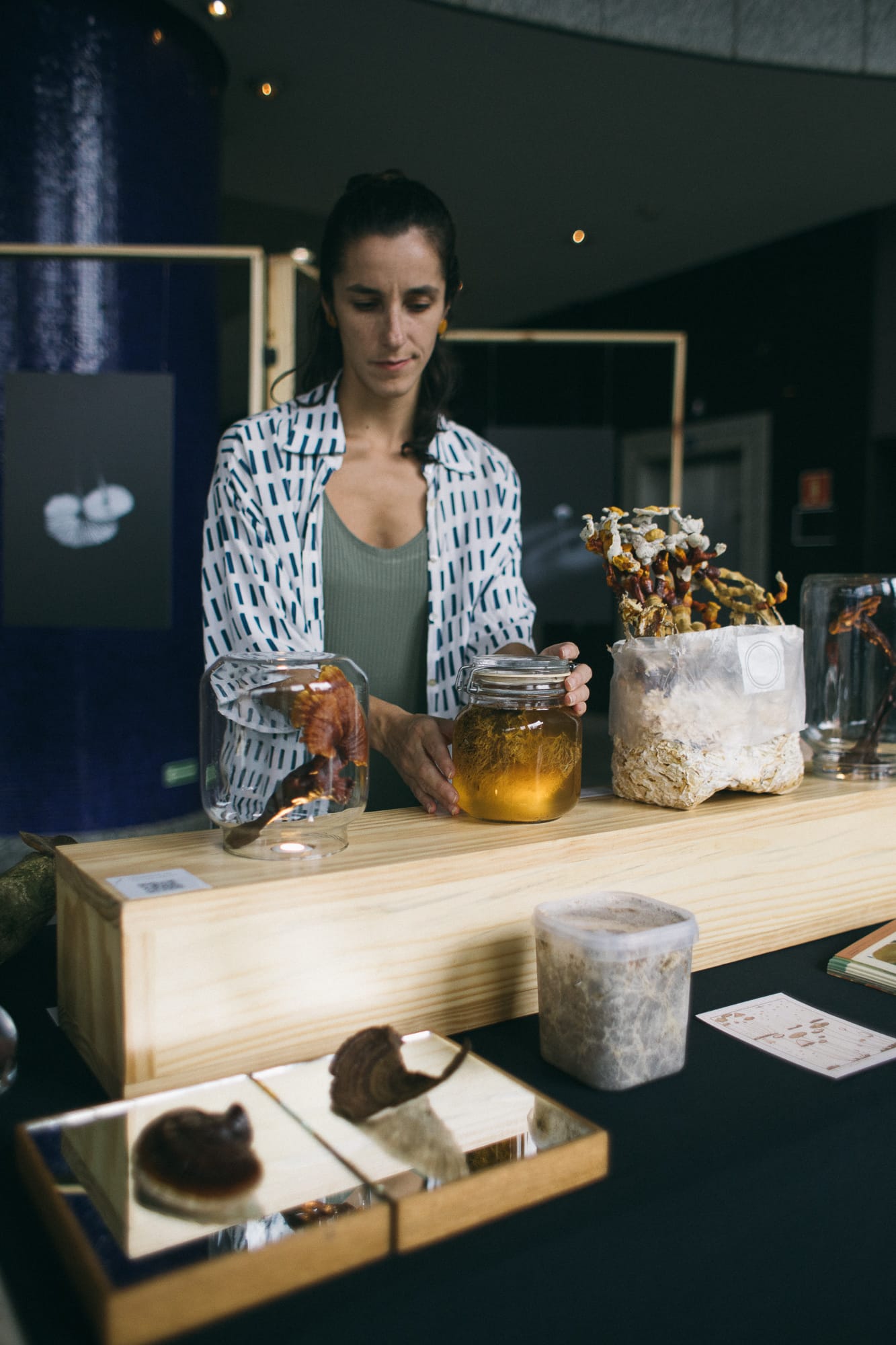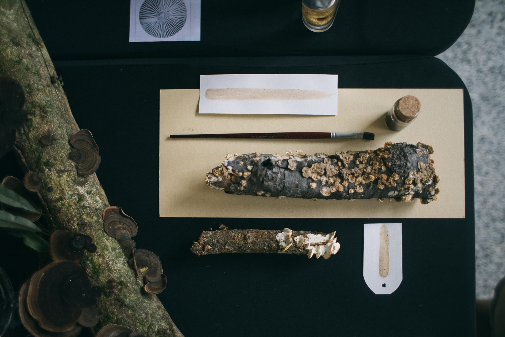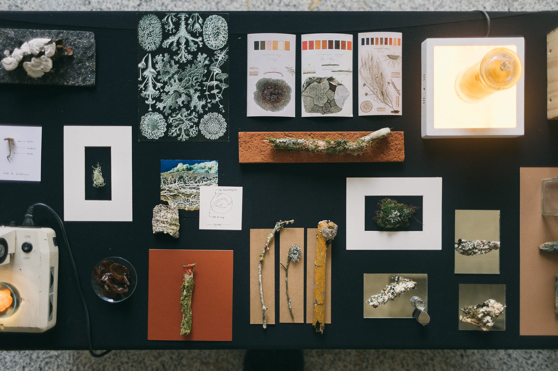 Mesa cartográfica com fungos preservados, representações e objetos etnobotânicos. Painel com 6 fotografias da série “a decomposição liga o céu ao chão” de Vitor Barão.