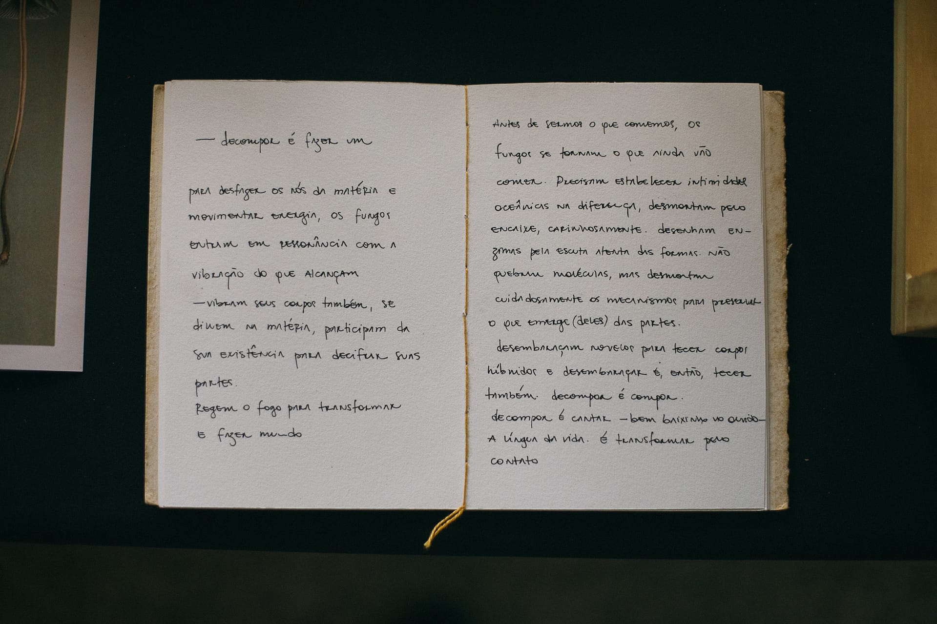 para desfazer os nós da matéria e movimentar energia os fungos entram em ressonância com a vibração do que alcançam – vibram seus corpos também, se diluem na matéria, participam da sua existência para decifrar suas partes. regem o fogo para transformar e fazer mundo. antes de sermos o que comemos, os fungos se tornam o que ainda vão comer. precisam estabelecer intimidades oceânicas na diferença, desmontam pelo encaixe, carinhosamente. desenham enzimas pela escuta atenta das formas. não quebram moléculas, mas desmontam cuidadosamente os mecanismos para preservar o que emerge das partes. desembaraçam novelos para tecer corpos híbridos e desembaraçar é, então, tecer também. decompor é compor. decompor é cantar -bem baixinho no ouvido- a língua da vida. é transformar pelo contato.